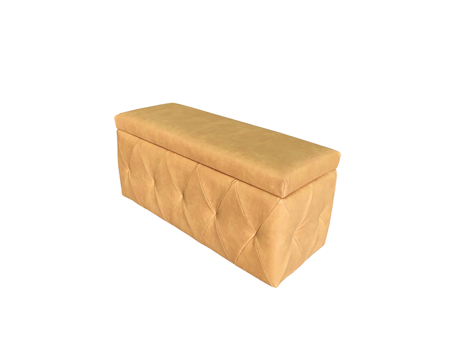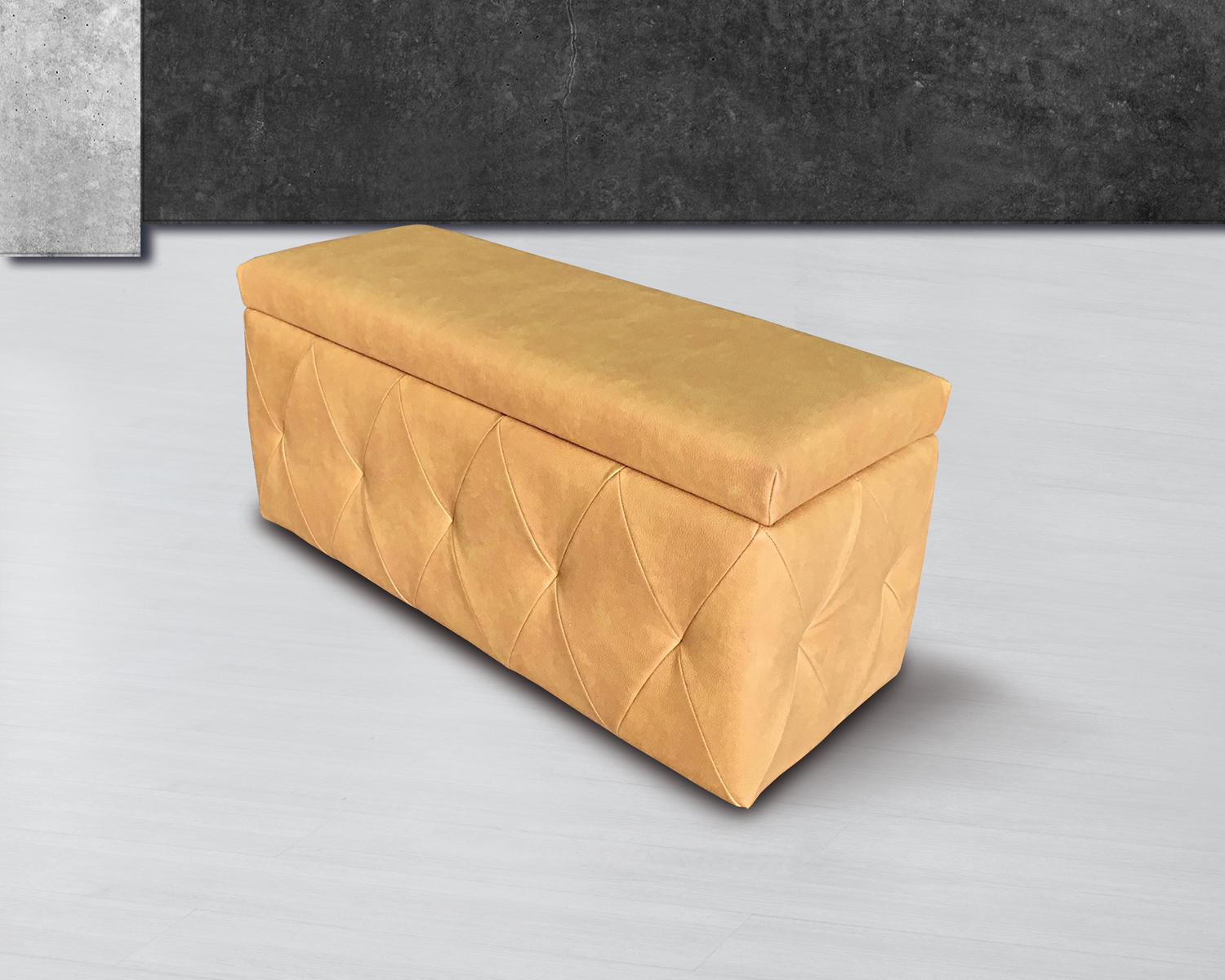 Banqueta estofada com baú de arrumação, tampa e capitonê nas laterais.