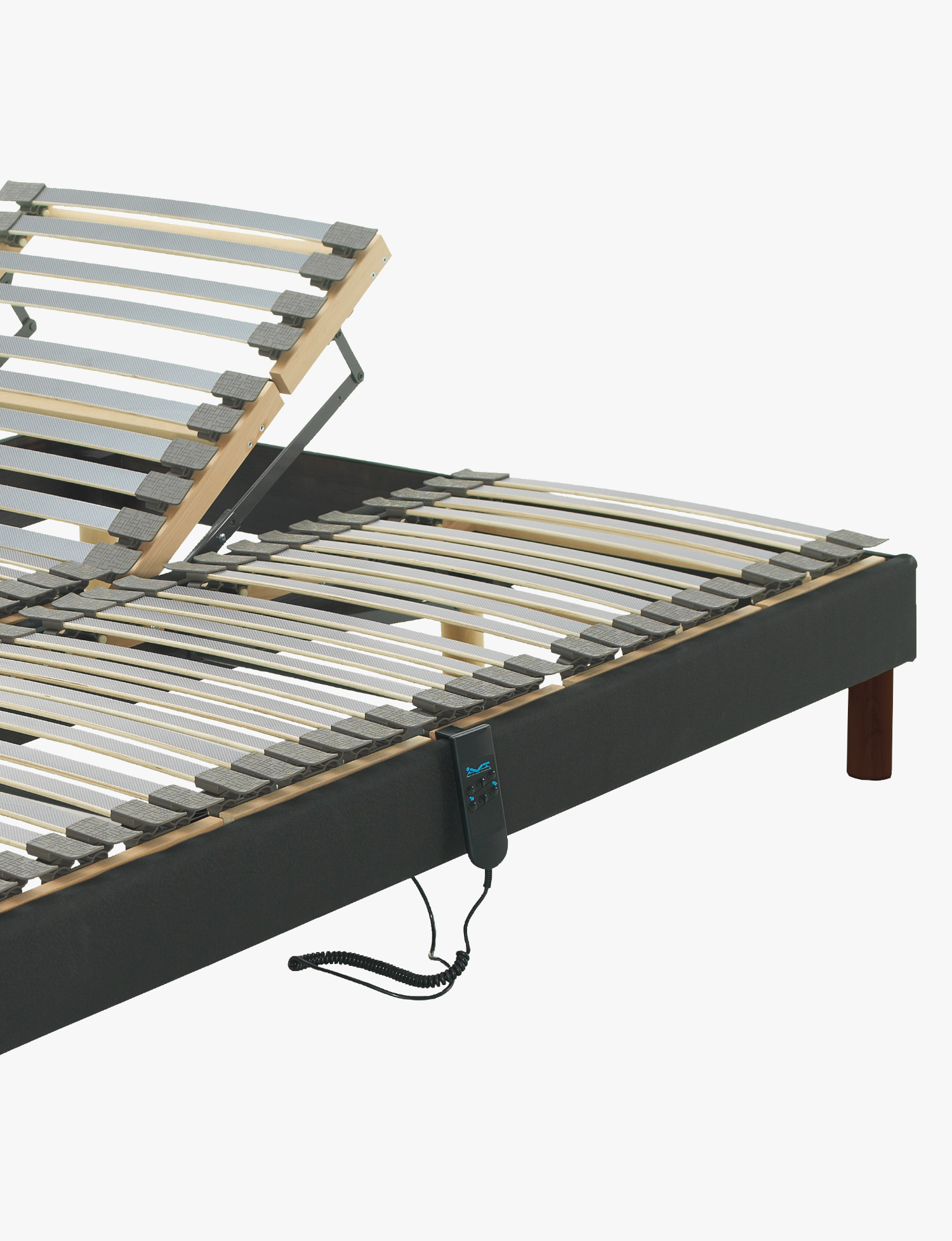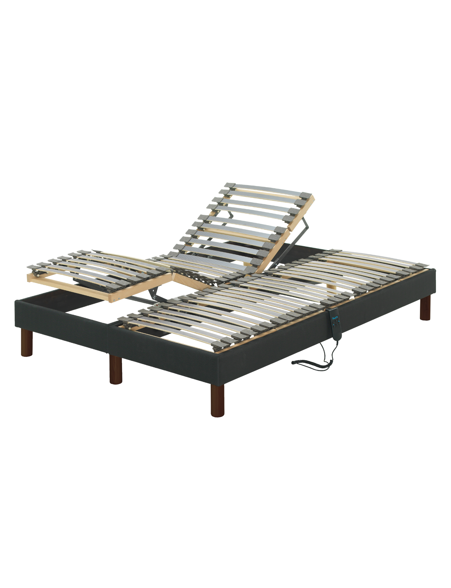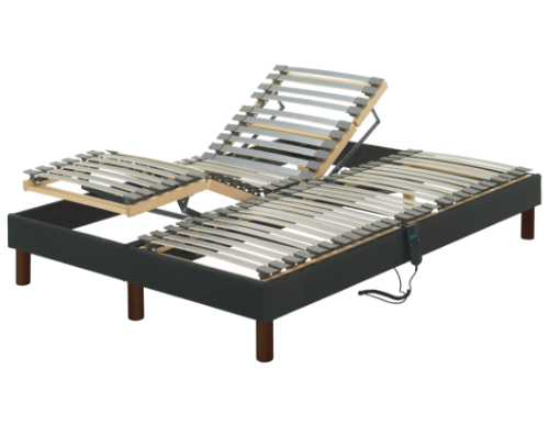 Cama articulada elétrica com estrado dividido que possibilita a articulação individual. Mecanismo controlado através de comando, posicionado na lateral da cama.