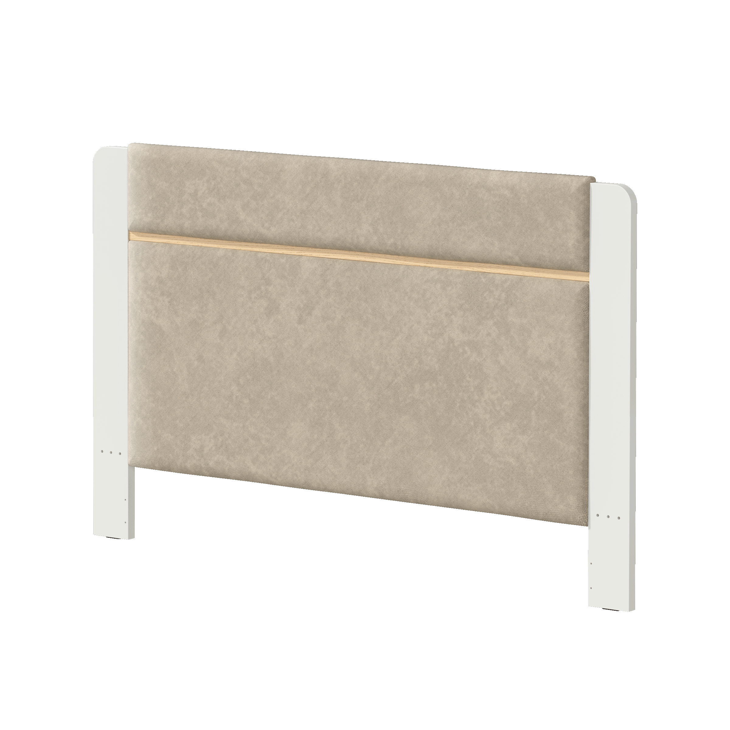 • Cabeceira estofada com painéis de tecido no tom bege e régua decorativa em madeira de freixo envernizada.