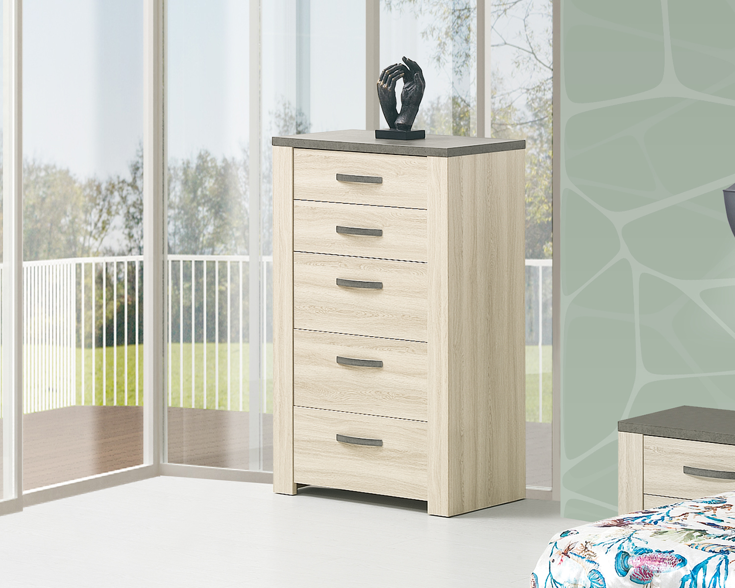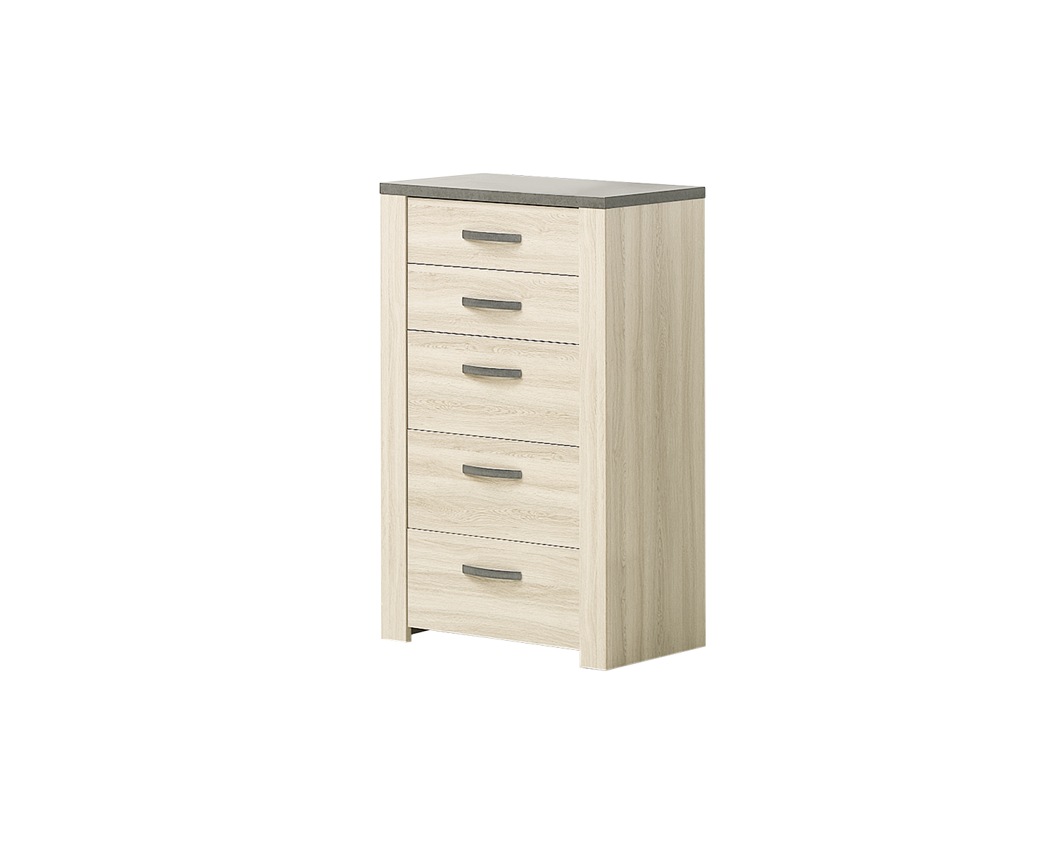 Mantenha tudo em ordem com a ajuda do camiseiro Estoril. Com 5 gavetas e um modelo exclusivo e eclético, combina a folha de carvalho com apontamentos de cinza. A opção perfeita para preencher o seu quarto de elegância.
