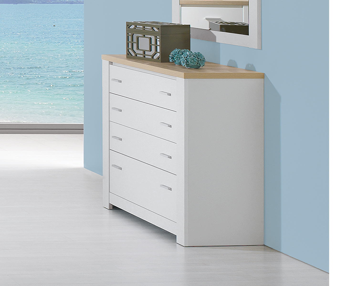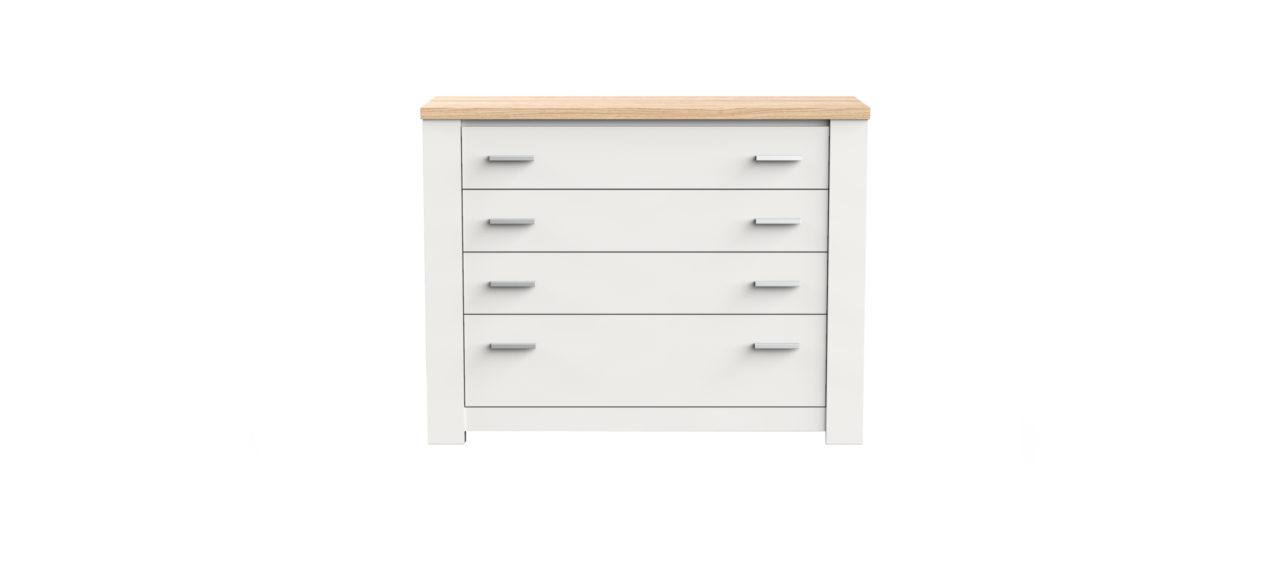 Com 4 gavetas, a cómoda Florença é a peça ideal para arrumar e organizar tanto roupa como objetos pessoais. O acabamento branco e carvalho confere-lhe um ar elegante e acolhedor.