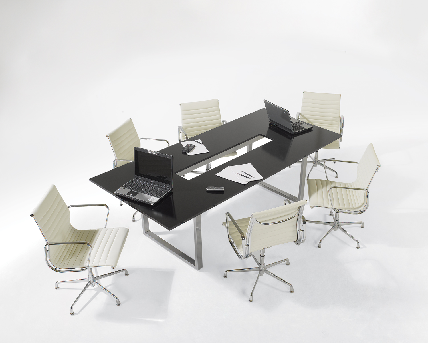 Mesa de linhas direitas, com abertura central. Um modelo exclusivo que pontuará qualquer escritório de elegância. Disponível em diversos acabamentos da estrutura e tampo.