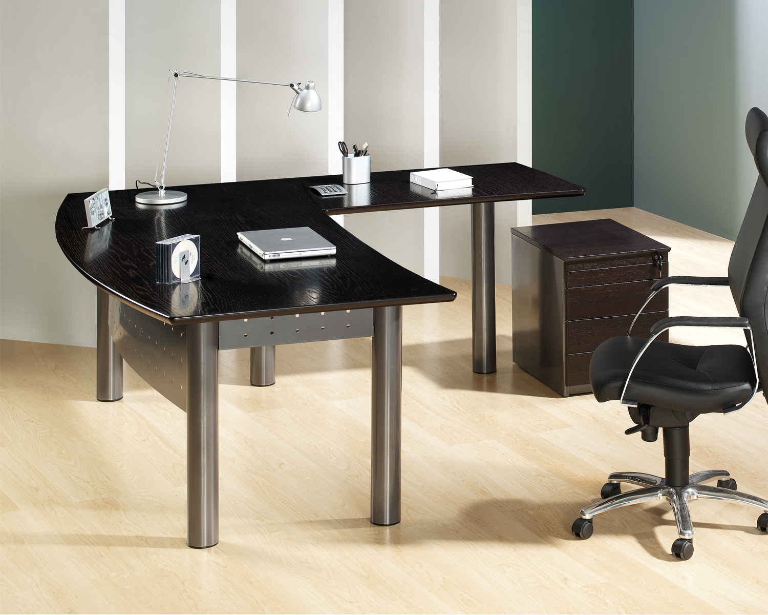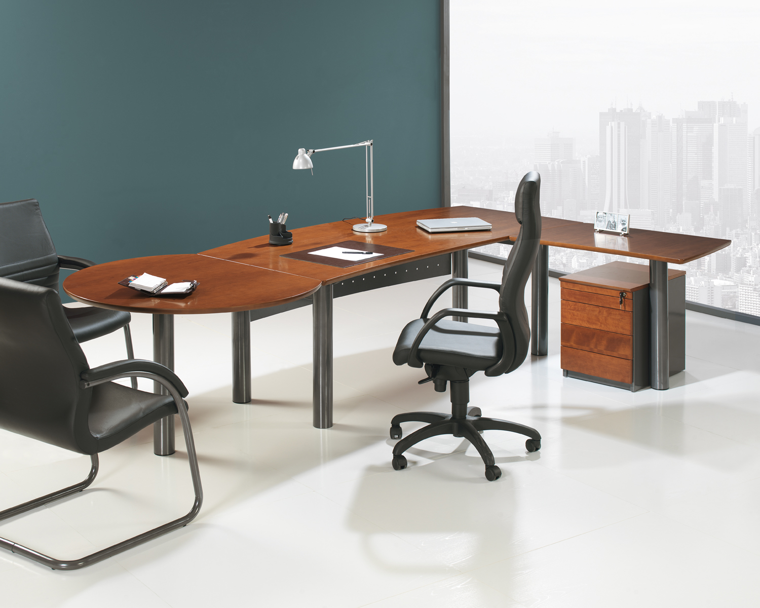 Marcada por uma forte personalidade, com uma estrutura metálica que suporta uma superfície de trabalho elegante de formato curvilíneo, é uma secretária associada a espaços elegantes e de prestígio.