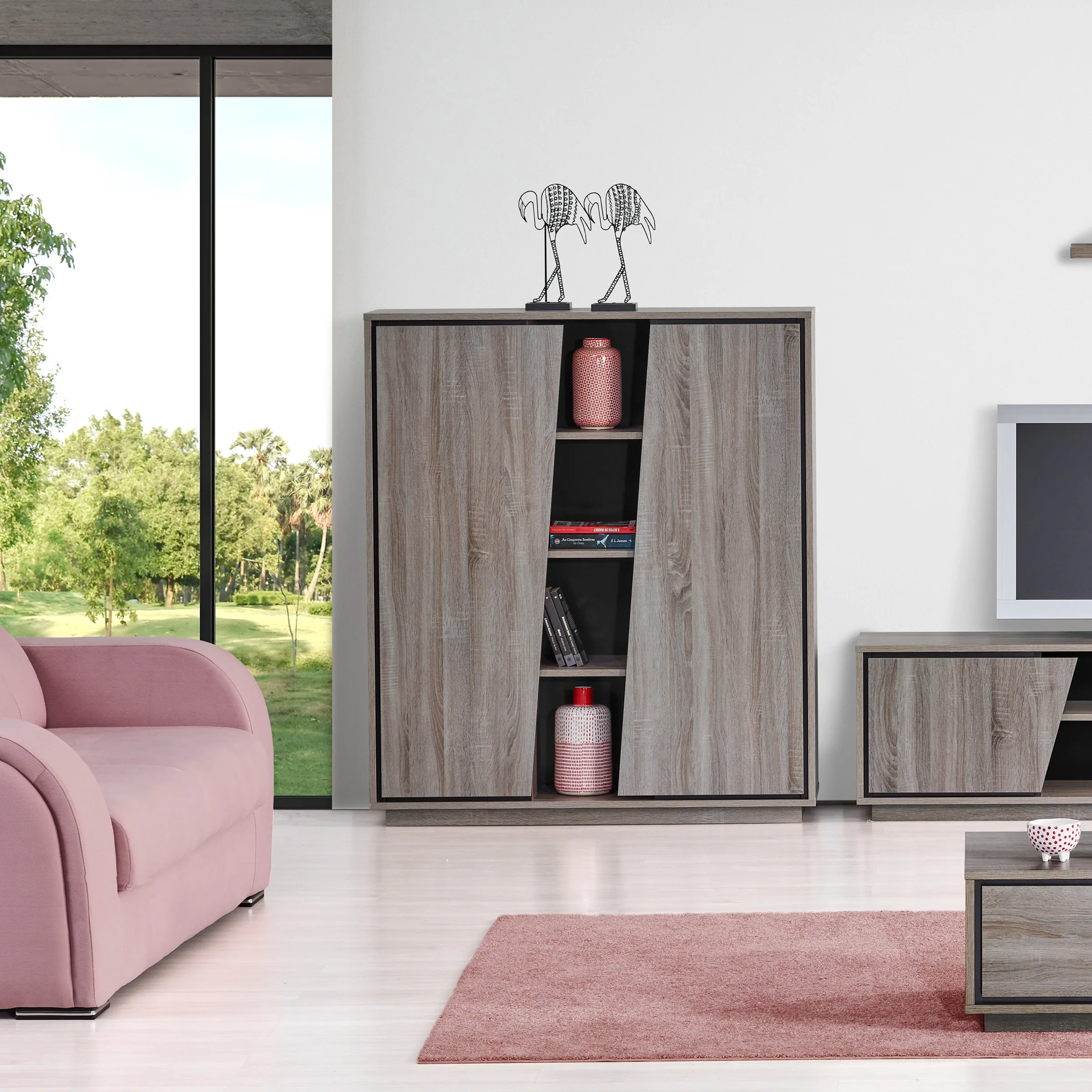 - O design refinado faze sobressair a sobriedade do carvalho (carvalho cinza com detalhe preto ou carvalho natura com detalhe branco).