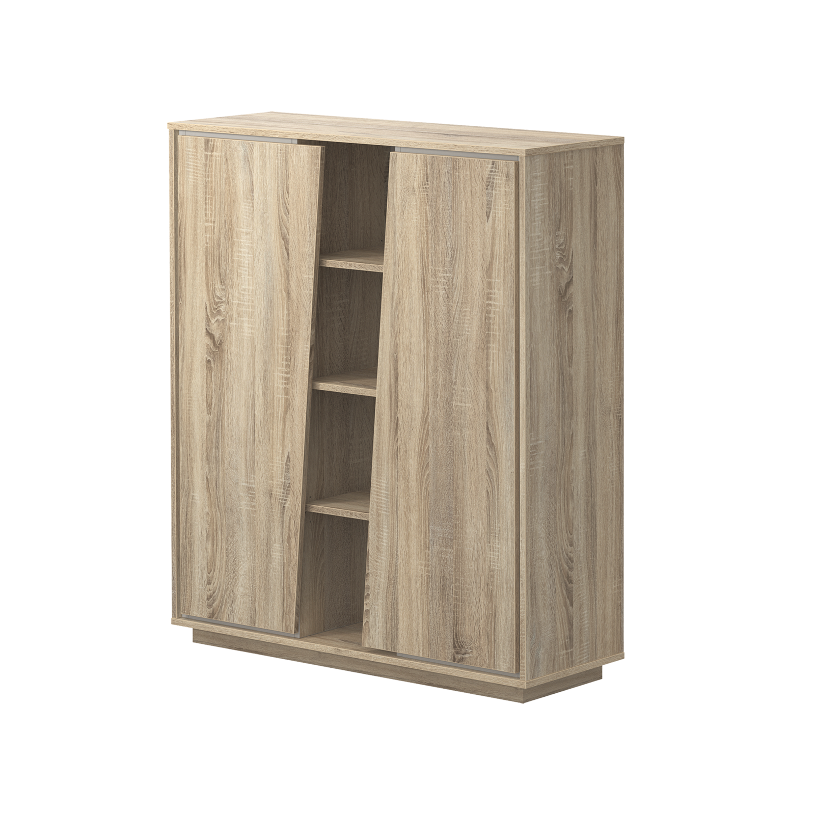 - Tem três prateleiras centrais e dois compartimentos fechados.