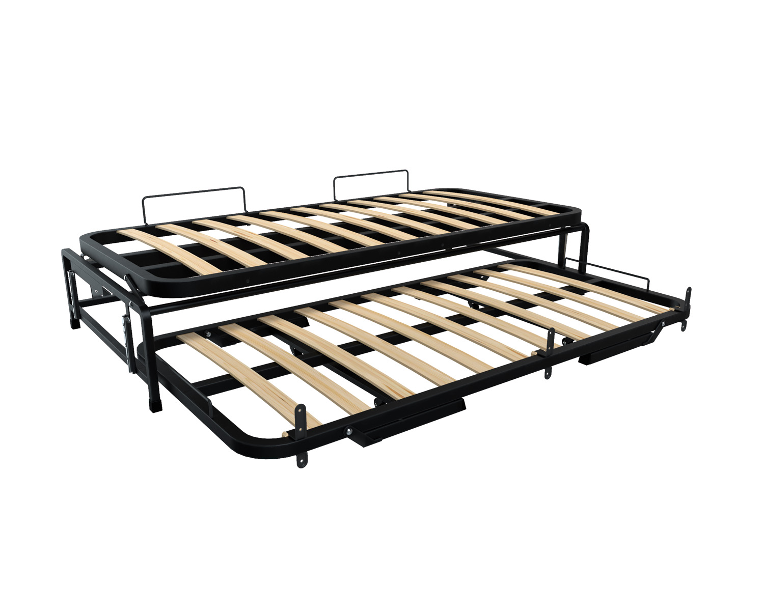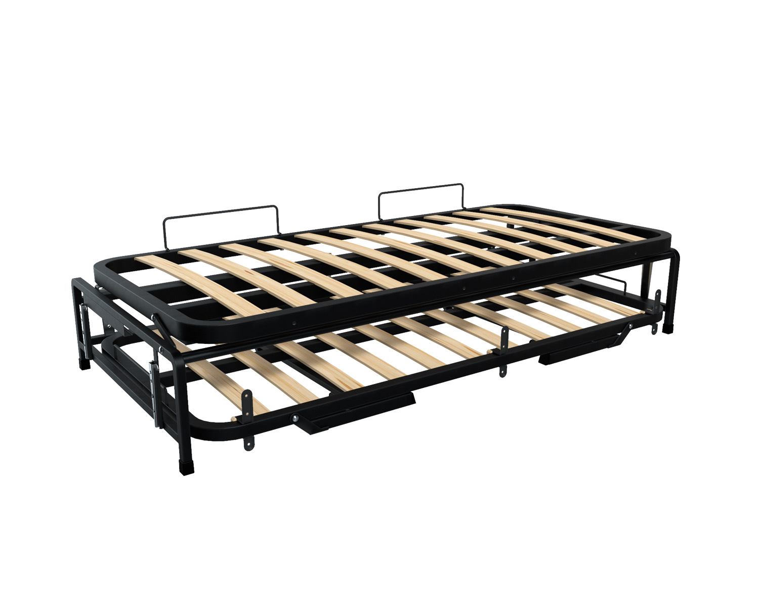 Mecanismo especialmente desenvolvido para hotelaria, o estrado Euronido Réguas funciona como uma cama encaixável composta por dois sommiers metálicos com réguas de madeira. Quando encaixados permitem ganhar espaço útil e quando abertos proporcionam uma cama dupla ou duas camas separadas.