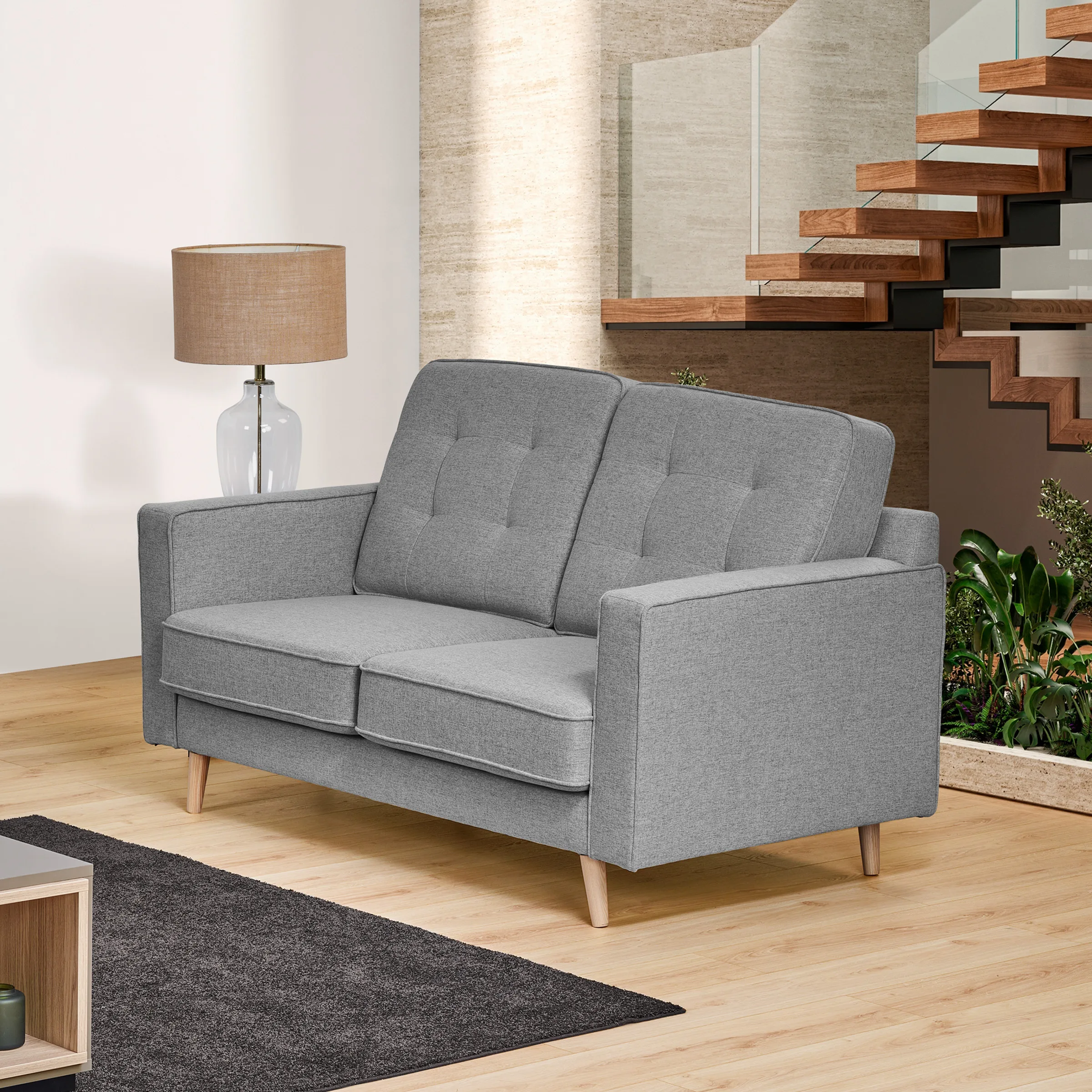 • Sofá com um design original e elegante, suavizado pelos pés cónicos de madeira.