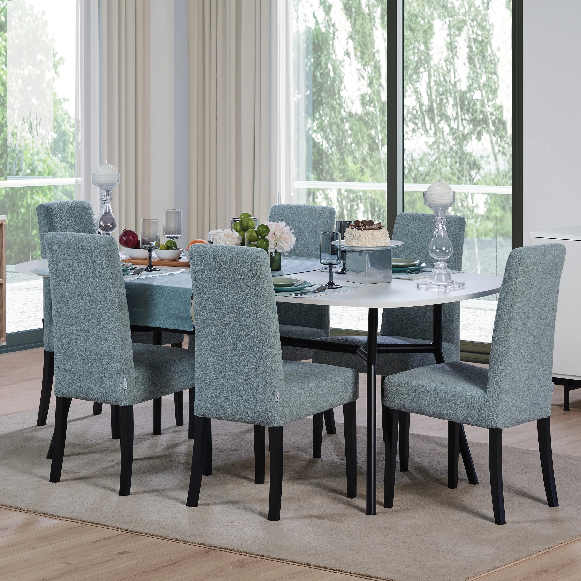 - Uma mesa fixa, ligeiramente ovalada, com estilo vintage.
