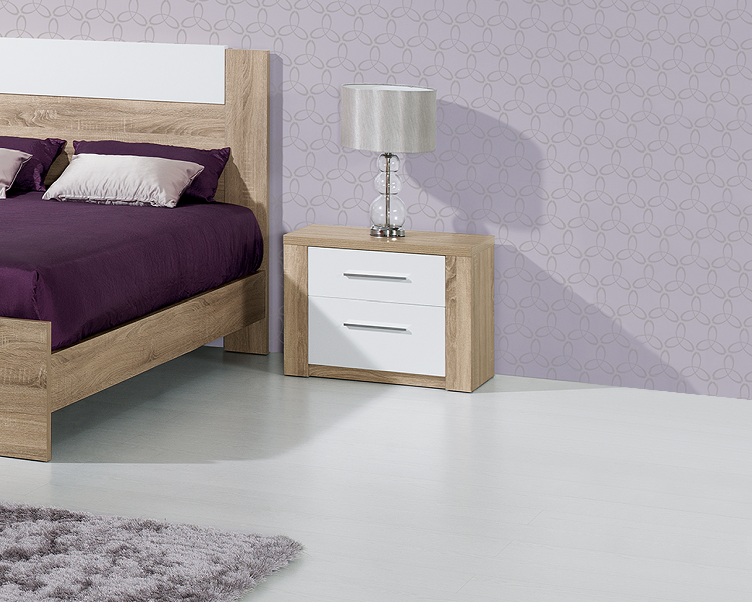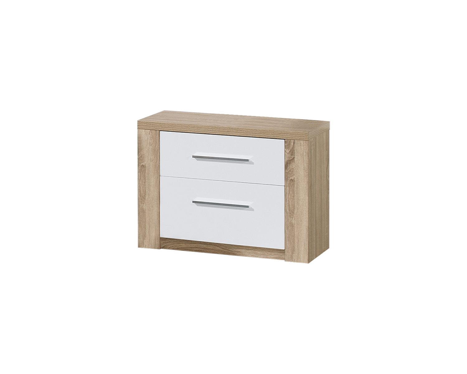 Mesa de cabeceira com linhas simples e direitas. A combinação do branco com carvalho natural confere-lhe um ar sofisticado que permite criar um ambiente exclusivo e elegante no quarto. Com 2 gavetas para arrumação.