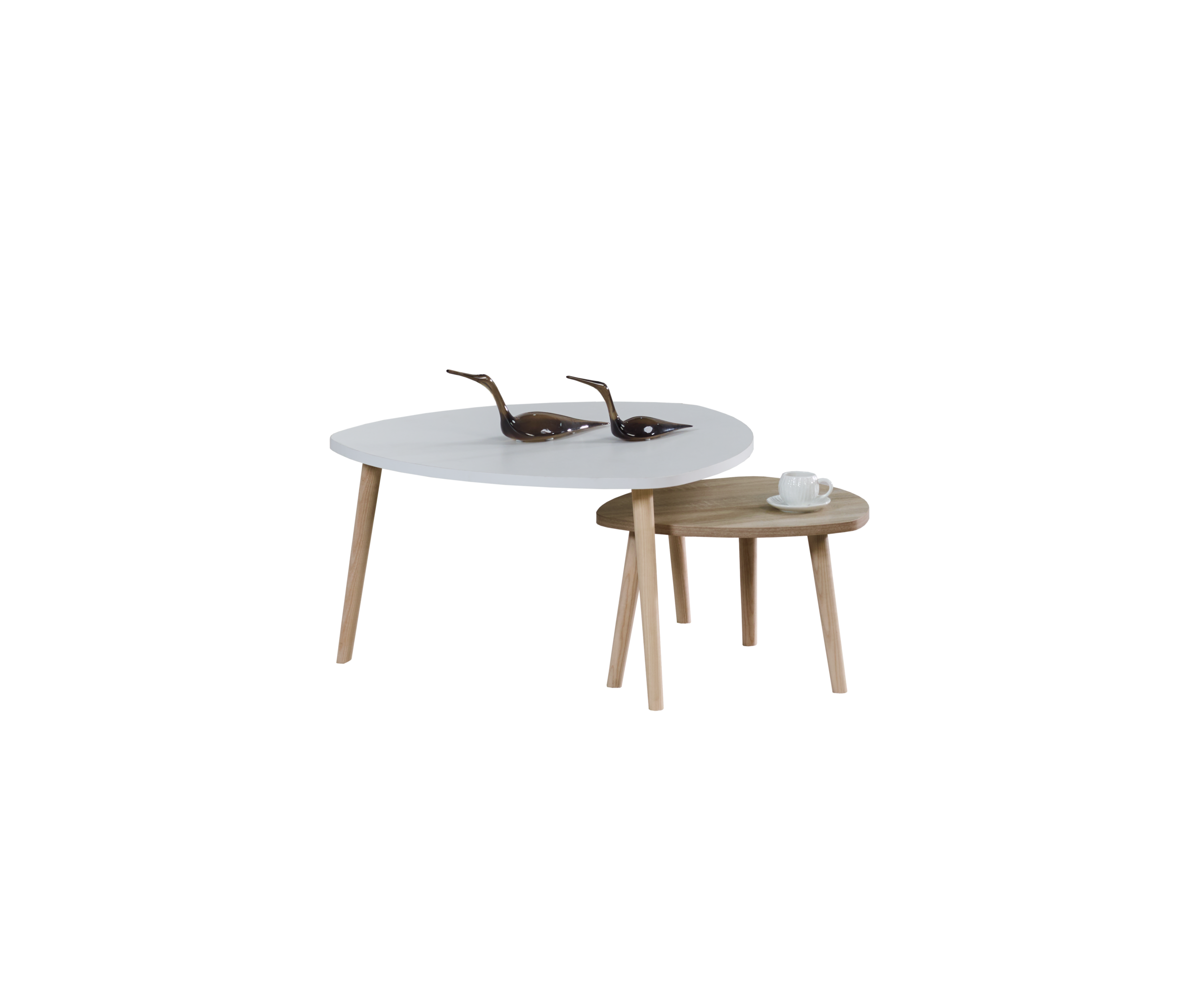 A forma irregular dá personalidade a estas duas mesas de centro que podem ser usadas individualmente ou em conjunto, para poupar espaço. Com design de inspiração nórdica e acabamento que conjuga o branco mate com o carvalho natura, conferem um ambiente acolhedor e natural à sua sala.