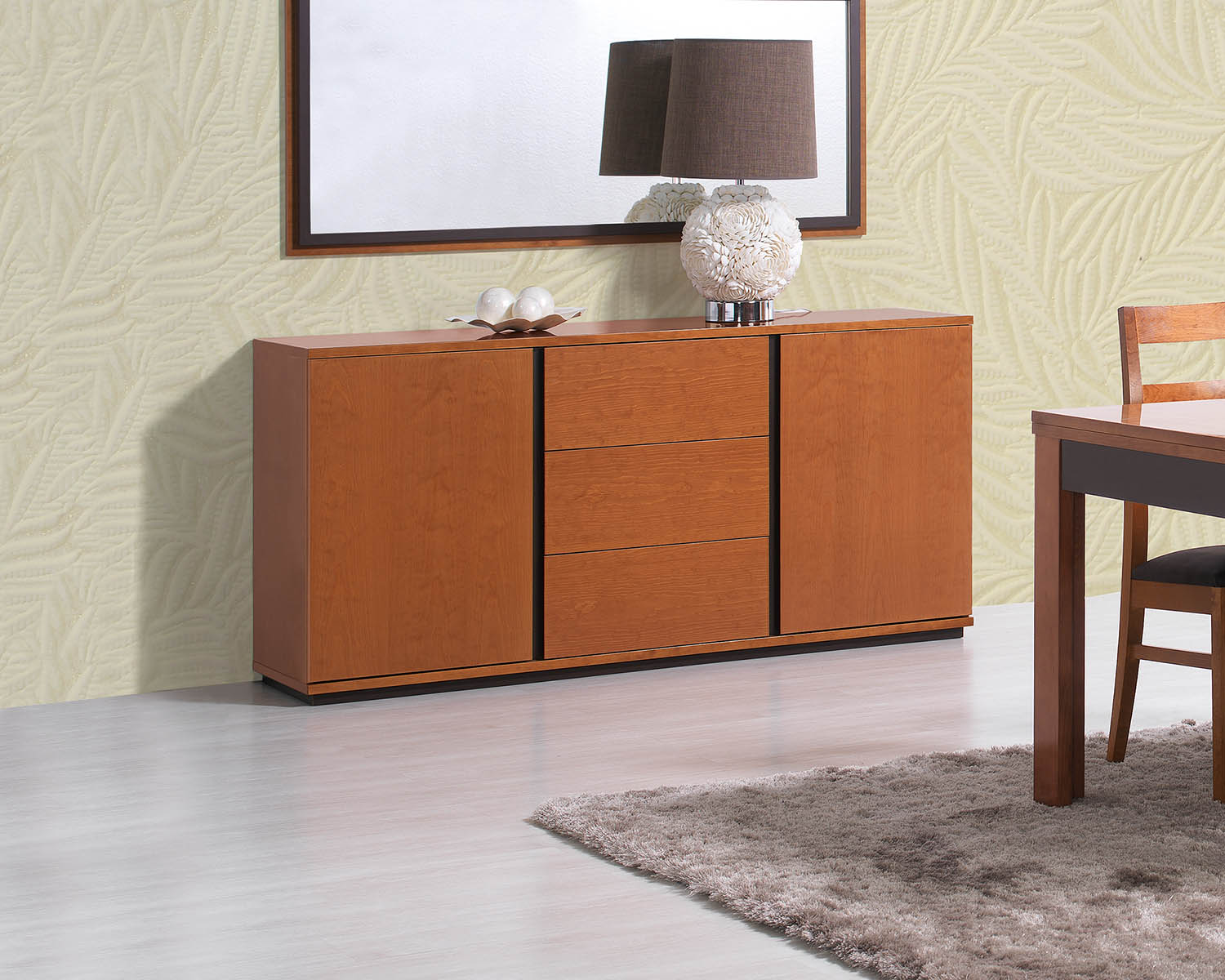 Um aliado em duas frentes: arrumação e decoração! Aparador de linhas direitas, com duas portas e três gavetas, onde predomina a sobriedade do pinho mel reforçada pelo detalhe em tom wengué. É funcional e elegante, com um design sofisticado e contemporâneo.