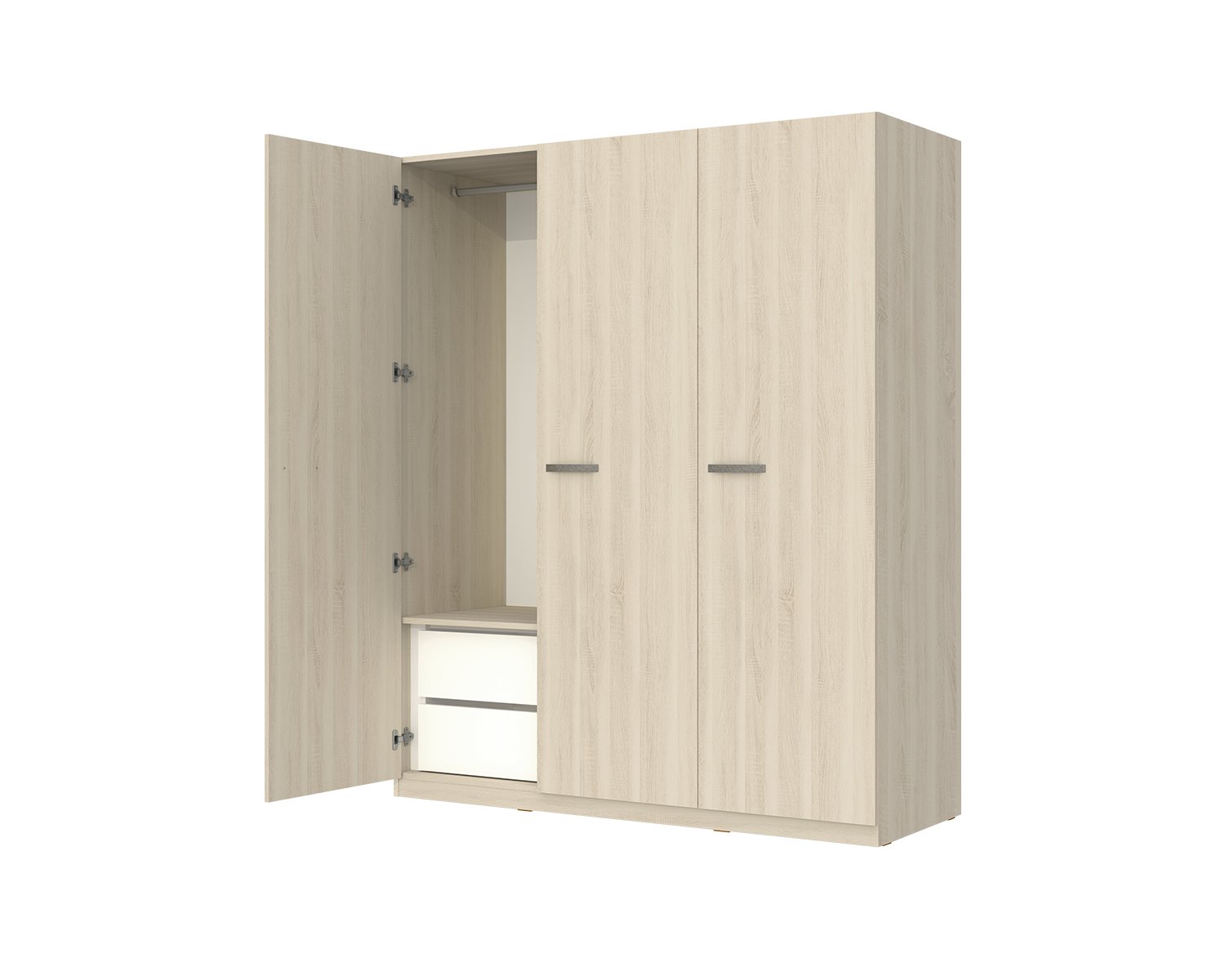 A solução para organizar a sua roupa sem abrir mão da decoração. Roupeiro de 3 portas de bater, de linhas simples, em folha de carvalho. Pode ser conjugado com a restante coleção de quarto Estoril, ou com outras peças de mobiliário.